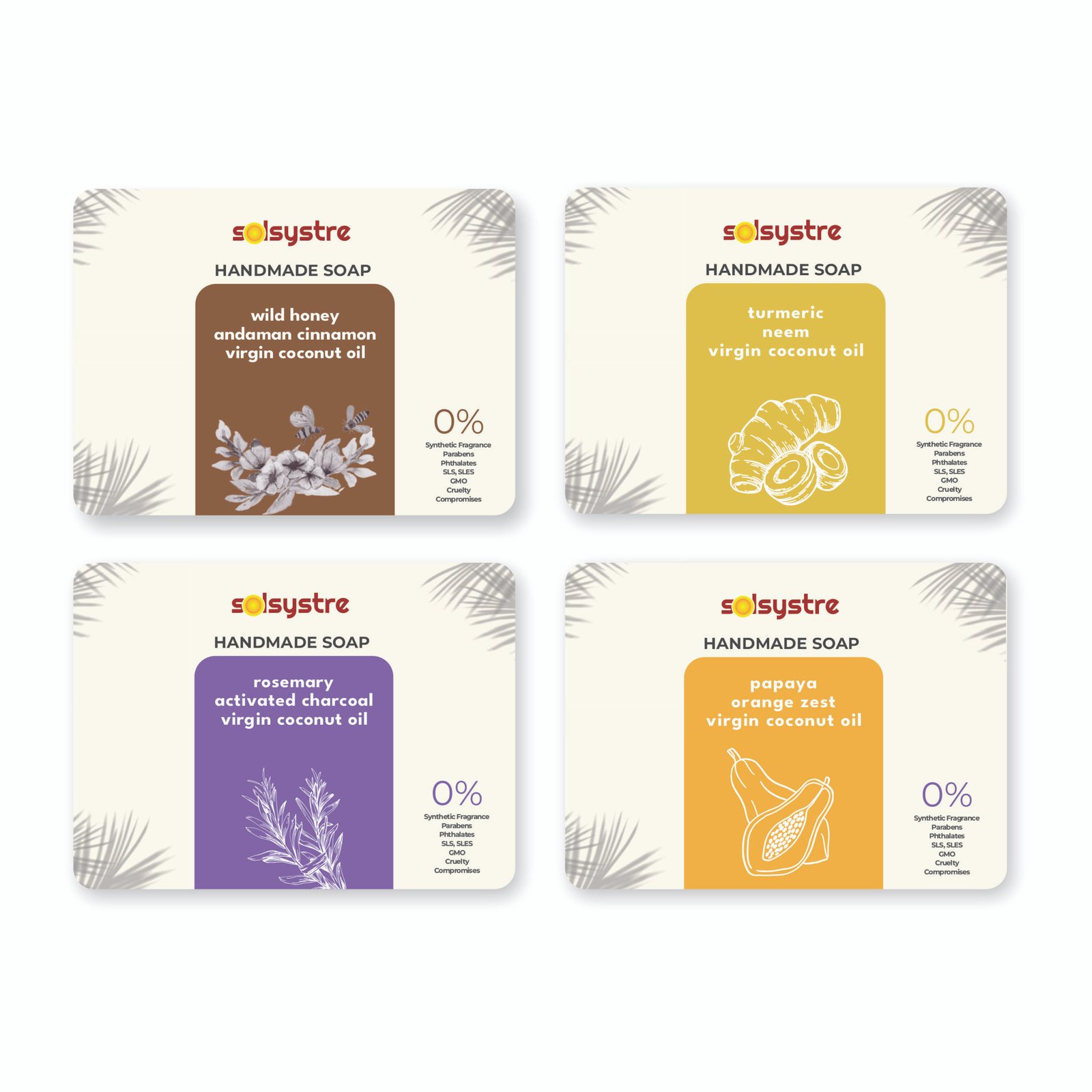 Indulge your skin with the purest care from Solsystre Handmade Soaps – an assorted pack of four luxurious, natural bathing bars, each crafted with organic, skin-loving ingredients like Virgin Coconut Oil, Wild Honey, Papaya, Turmeric, Neem, Cinnamon, and Activated Charcoal. This curated collection is designed to cater to all skin types and needs, offering deep nourishment, gentle exfoliation, brightening, and anti-aging benefits in every bar.