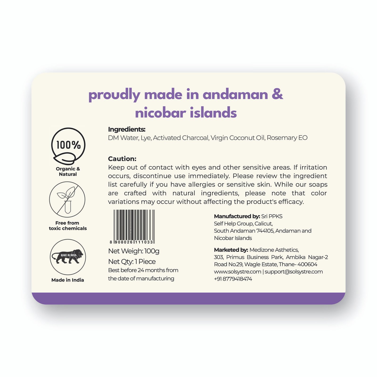 Solsystre Rosemary, Activated Charcoal & Virgin Coconut Oil Handmade Soap is a 100% organic, cruelty-free soap that deeply cleanses, detoxifies, and nourishes all skin types. With its powerful blend of ingredients, it leaves your skin refreshed, hydrated, and glowing, perfect for daily use.