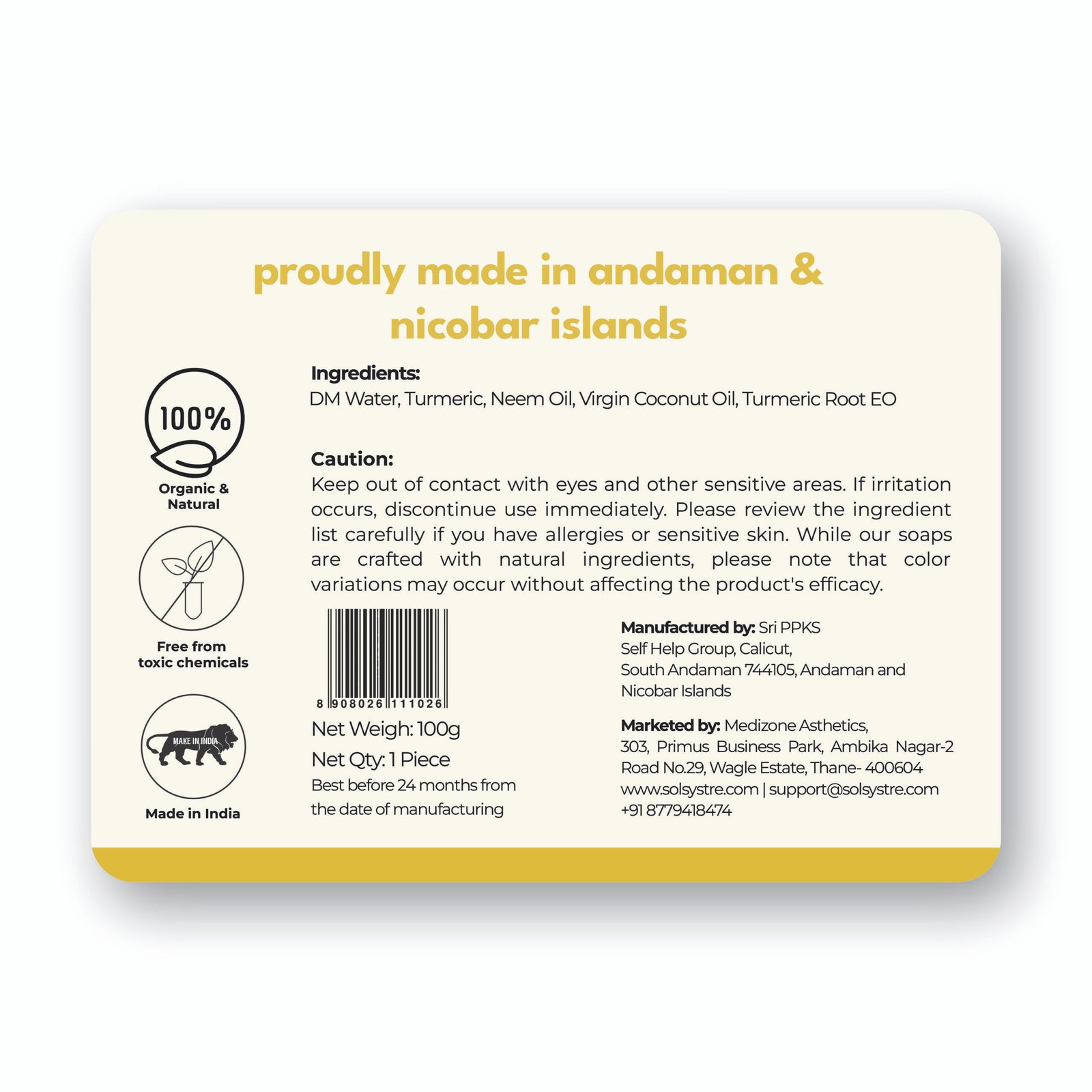 Solsystre Handmade Soap is a 100% natural, vegan, and cruelty-free blend of Organic Turmeric, Neem, and Virgin Coconut Oil. Ideal for daily use to detan, it brightens, detoxifies, and deeply moisturizes, helping to reduce acne, inflammation, and tan, while promoting clear, smooth, and radiant skin.